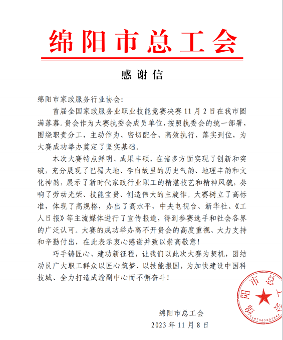 綿陽(yáng)市家政服務(wù)行業(yè)協(xié)會(huì)力助首屆全國(guó)家政服務(wù)業(yè)技能競(jìng)賽決賽在綿陽(yáng)圓滿落幕,綿陽(yáng)市總工會(huì)高度贊揚(yáng),綿陽(yáng)市美新家政熱烈祝賀!